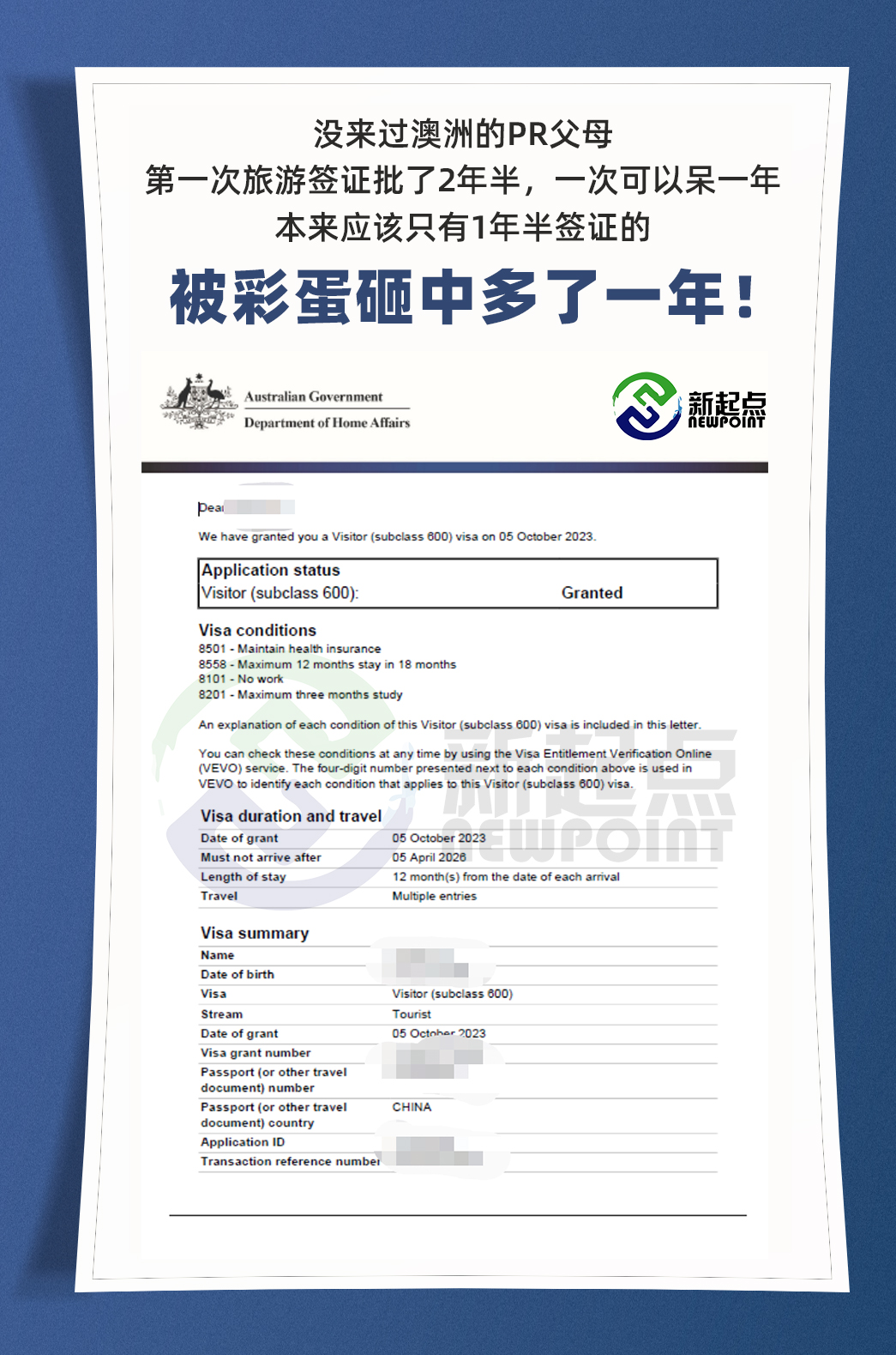 恭喜**Qin获得600签证!