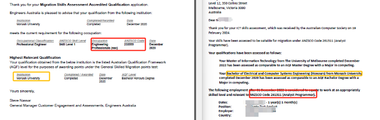 Though it's possible to obtain outcomes for two occupations, it's important to note that the occupation identified through EA skill assessment won't be Software Engineer/Analyst Programmer but rather Engineering Professional NEC 233999. If students wish to immigrate using 261311/261313 Analyst Programmer/Software Engineer to lodge EOI, they must opt for ACS skill assessment, completing 1 year of relevant work experience or PY post-graduation.