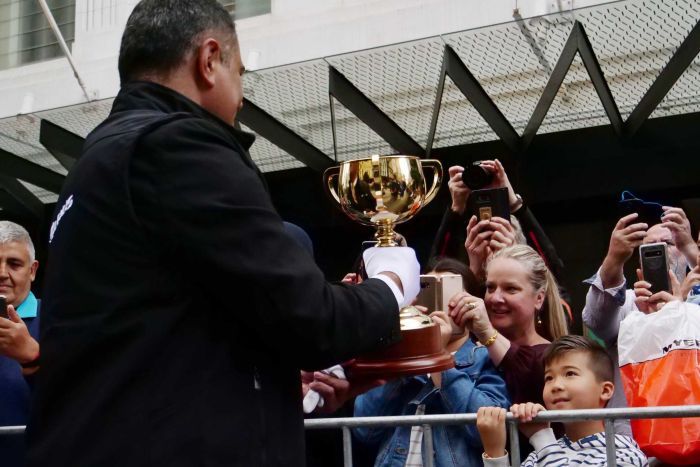 A procession of thoroughbreds, jockeys and trainers headed down Swanston Street to Federation Square a day ahead of the big race at Flemington.