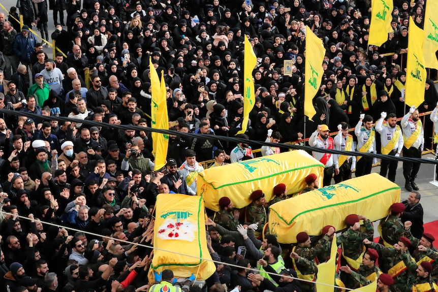 Hezbollah fighters carry the coffins for the trio.(AP: Mohammed Zaatari)