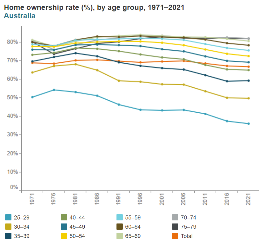 Home ownership rates have been falling for most age groups, but the younger the group generally the steeper the decline.(Supplied: AIHW)