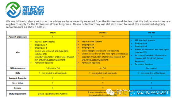 新起点根据PY以及NATTI内部机构透露消息,持485, 476,457, 573签证可以就读PY(professional years),持有学生签证485的TR或PSW、过桥签证A和B、573高等教育签证、457、雇主提名签证的副申请人等签证皆可以申请PY职业年!
