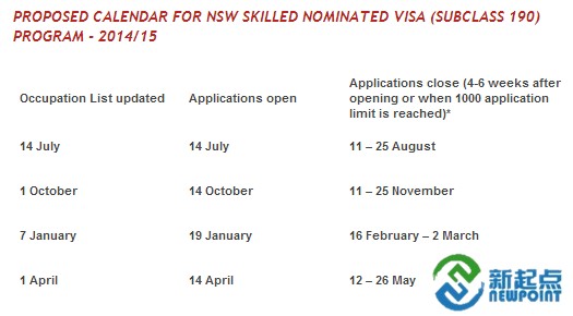 新南威尔士州本财政年度预计的州担保申请将开放4次,开放日期分别是2014年7月14日和10月14日,2015年1月19日和4月14日。