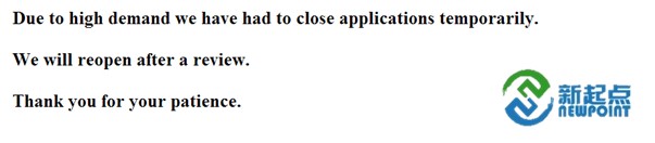 由于本昨天10点开启的州担保竞争空前激烈,短短30分钟左右,1000个州担保名额据估计几乎被使用殆尽。据新起点顾问的预测,虽然本次名额几乎用尽,但是如果新州政府在进行审核后发现有一些严重不符合条件的申请人,还是有希望会因为这一小部分空出来的名额而重新开启通道,只是时间难以预估。目前州政府官网上申请通道的显示如下图