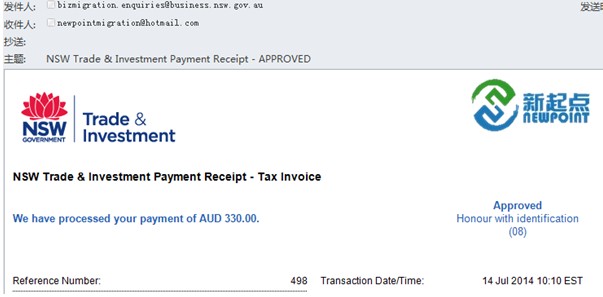 通过新起点全体移民顾问们的充分准备和同时填写,于今日30分钟内成功递交了若干州政府担保申请。仅在此恭喜Ms HONG, Ms HAN, Mr LI, Mr ZHANG, Ms WEI, Ms WANG, Mr YU, Mr CHAN, 18 人顺利递交新州州担保申请并且将获得PR申请中至关重要的5分加分。下面列举了成功递交的州担保申请之一的扣费信息截图,今年州担保的费用维持不变,还是$330澳币。