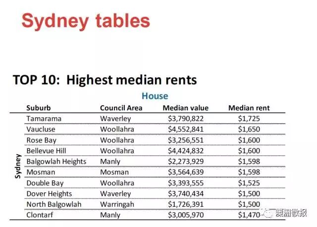 房产数据库CoreLogic RP统计2016年悉尼地区租房中间价排名得出结论如下,悉尼区最火爆区域的别墅出租中间价高达1735刀!
