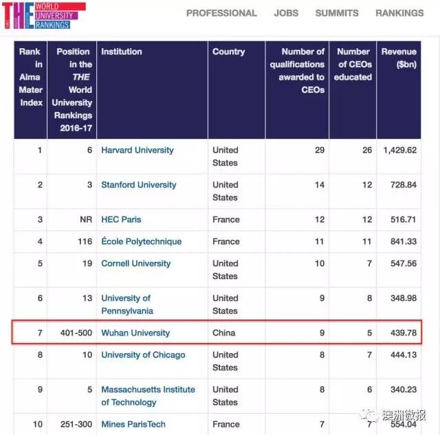 榜单前十中,中国武汉大学作为亚洲地区唯一一所高校、中国排名最高高校,位列第七,共有9名CEO!