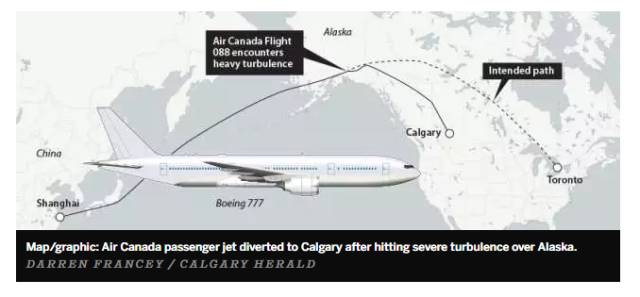 TSB的调查报告表示:当年加航的那架波音777飞机,机上载有332名乘客和19名机组人员,在阿拉斯加上空遭遇了强大气流。