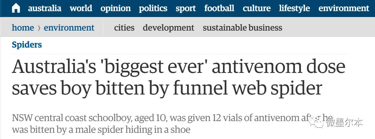 本周一,一名十岁的悉尼小男孩被一只致命的漏斗网蜘蛛(funnel-web spider)咬伤,总共使用了12支抗毒血清才脱离了生命危险。这成为了澳大利亚历史上使用抗毒血清剂量最大的一次。
