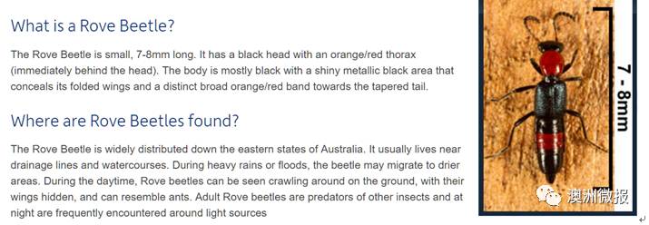 新州的卫生部还特意在官网上提示,如果身上落有隐翅虫,千万别用手去拍它,最简便的方法就是将它抖落在地踩死。如果你压碎了甲虫,毒素就会被你的手上或虫子接触的皮肤吸收,传播到身体的其他部位和其他部位。