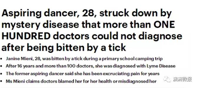 2014年Janine的病才被确诊了,叫做:慢性晚期莱姆病,这种病是由于被蜱虫叮咬后产生的症状。