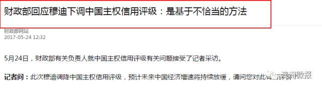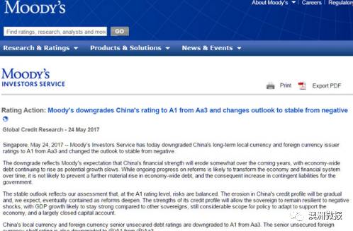 今天,国际评级机构穆迪Mood’s将中国主权评级从A1下调至Aa3;展望调至稳定,此前为负面,称中国的主权评级反映中国的金融实力将在未来几年有所减弱。