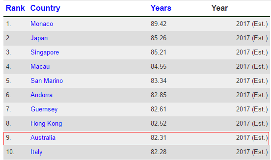 澳洲人均寿命82岁,排名前十,而且这是包括了平均寿命为60岁的澳洲土著的情况下。