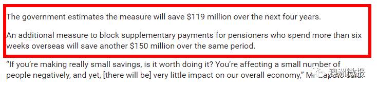同时,上问我们提到的“PR持有者如果离开澳洲境内6周以上,政府福利补助金将会被削减”的政策一旦实施,将至少为澳洲政府在4年内节省1.5亿澳元。