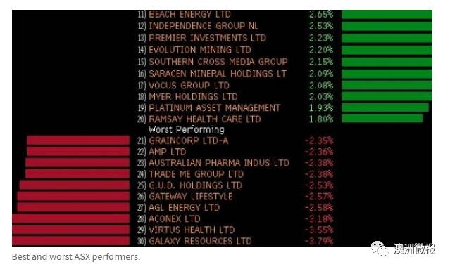 澳洲各大金融机构股市同样走低,ANZ银行下跌0.8%,CBA下跌0.4%,Macquarie Group下跌1.5%,Westpac下跌0.3%,NAB下跌0.4%。