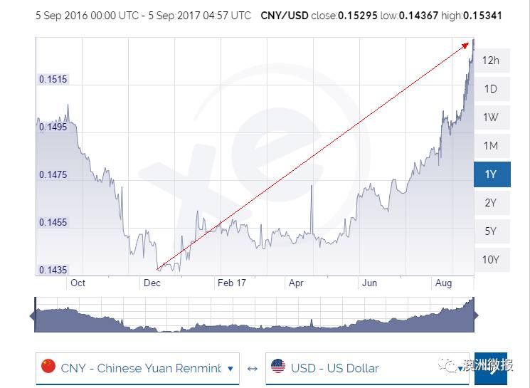 相对于人民币对美元的持续升值,人民币对澳元却是在持续贬值。幅度甚至远远超过对美元的升值幅度。