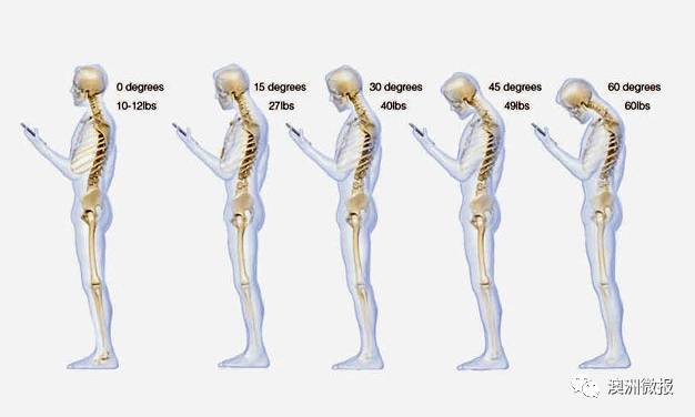 如果呈60°角,头部对颈椎造成的重量可达54斤。