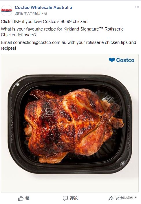 烤鸡对于Costco来说不仅仅是他们吸引客源的利器,更是成为了Costco的“社交达人”和“品牌形象大使”。Facebook甚至为其设置了烤鸡主页,一提到“烤鸡”,人们就会联想到Costco。