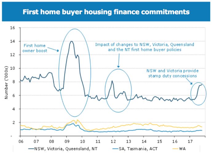 根据对首次置业者的情况统计,政府发布的对首次置业们减免印花税的政策(新州和维州)刺激了他们的复兴,帮助他们逐渐重新回到澳大利亚房地产市场主力军的位置。