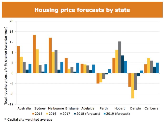从图上来看,墨尔本的房价走势将继续超越悉尼;布里斯班房价将走出颓势,并在2019年出现稳定增长。霍巴特的房价虽然增速放缓,但是依然会保持高于全国平均水平,达到5%;珀斯和达尔文的房价在2019年则会回到正增长区间,分别达到约2%和1%左右。