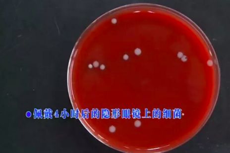 将美瞳上收集一些样本放在有生理盐水的细菌培养皿上,过后四小时,可以明显的看出有圆形的集中的细菌。