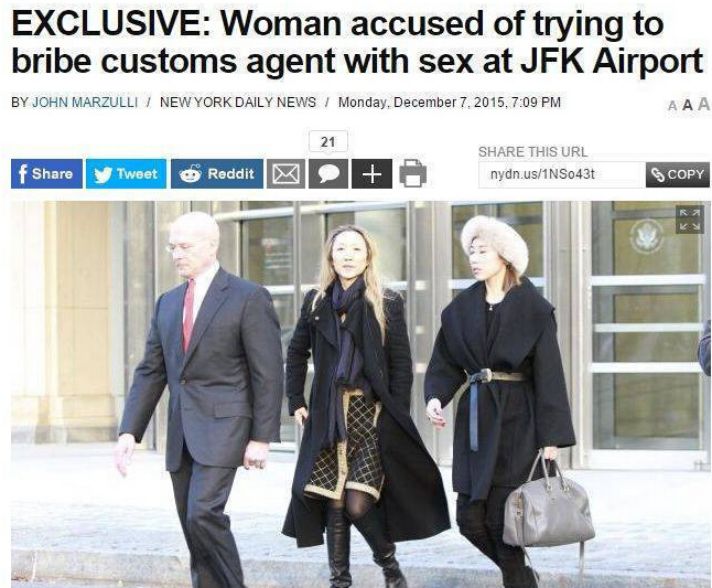 在2015年,55岁的中国女子杨红(化名)在纽约肯尼迪国际机场出境时,因为曾在入境时企图性贿赂美国海关关员而遭到逮捕。