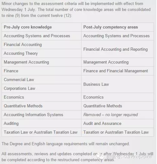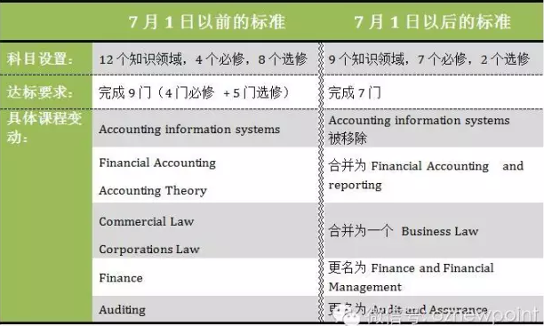 7月1日后,新的职业评估课程将原有12个知识领域合并为9个,这9个知识领域中,必修课程由4门增加到7门,选修则由8门减少的2门,只剩下审计(auditing)和税法(Taxation Law)。如下是官方课程评审标准对照表: