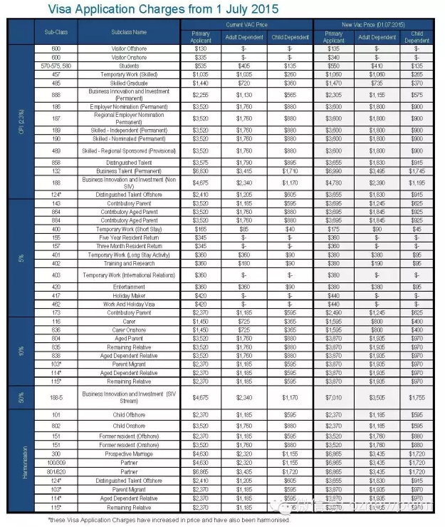 澳大利亚财政预算赤字在新财年2015-16 预计将高达$350亿澳元!为了弥补, 移民签证申请费理所当然的又躺枪,涨的让人心塞! 5月28日,涨价细节终于浮出水面,请看下图: