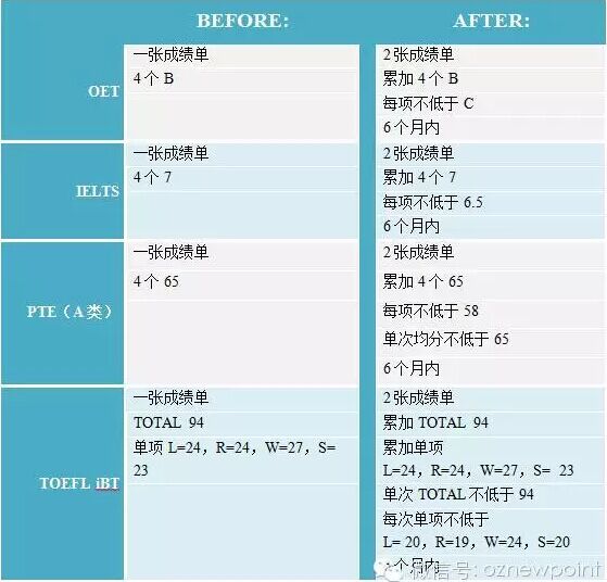 居然可以拼成绩!!!不是骗人的吧???这是真的,2015年7月1日起,澳洲护士注册英语要求降低了, OET、雅思、托福、PTE成绩都可拼起来用!小编给大家来个before和after的对比吧: