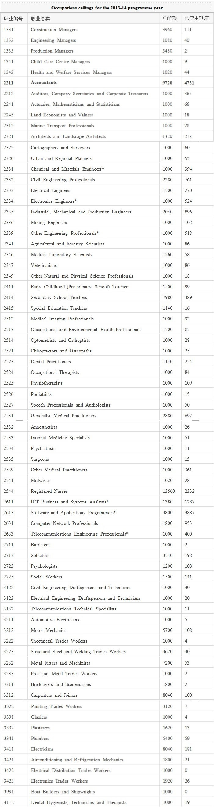 在查询完清单之后,仍旧要注意的就是,哪怕你的职业或者专业在移民清单里,但是还要注意本财政年度分配给你的的配额够不够。自从2010年吉拉德执政以后,澳洲全面采用新的Skill SelectProject——优选计划,意思就是如果你的移民分评分越高,就越容易获得政府邀请,进而申请PR。下面是新起点整理的部分配额表单,供大家参考: