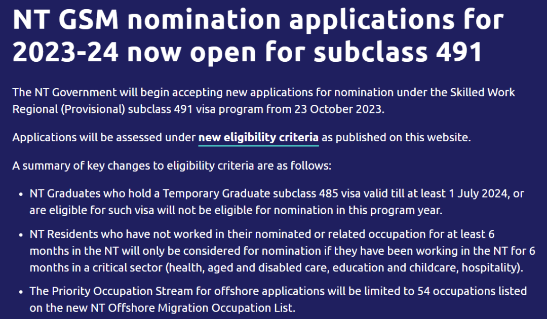 本财年北领地190配额250个,491配额400个。这样的配额下,为了处理去年的挤压等,190预计不会开放,目前只开放491的新申请同时提高要求,本地学生的485签证如果在2024年7月1日之后到期的,将不符合要求,只能等下财年。