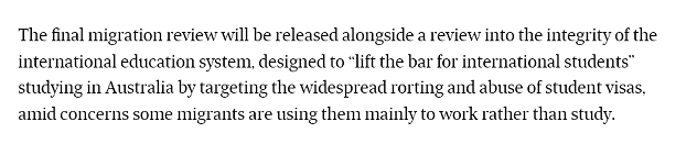 从上个财年起澳洲移民局改革考虑的重点都是不希望签证系统被滥用或利用。 就像学生签被滥用,挂名学校作为延长工作权利的途径,这次又再次被提及,明确指出要提高学生签证的难度,阻拦以工作为目的的学生签证。