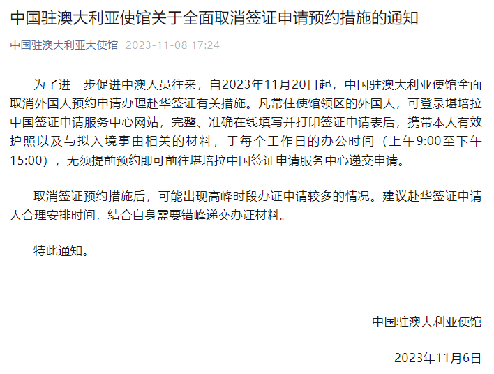就在11月6日,中国驻澳大利亚大使馆发布公告称, 为了进一步促进中澳人员往来,自2023年11月20日起,中国驻澳大利亚使馆全面取消外国人预约申请办理赴华签证有关措施。