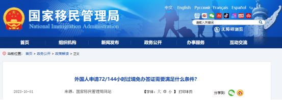 答:您好,感谢您对移民管理工作的关心和支持。外国人申请72/144小时过境免签,需要符合以下3个条件: