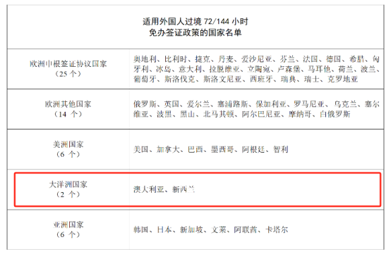 可以看到,在中国开放的免签国家名单中,大洋洲两个国家上榜,澳大利亚和新西兰都在列。