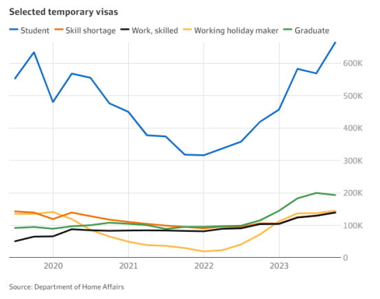 随着12万人持有的408签证在未来6到12个月内到期,这一高峰将开始减少。与此同时,在2023-24财政年度,政府发放的技术签证和地区签证数量比前一年下降了80%。