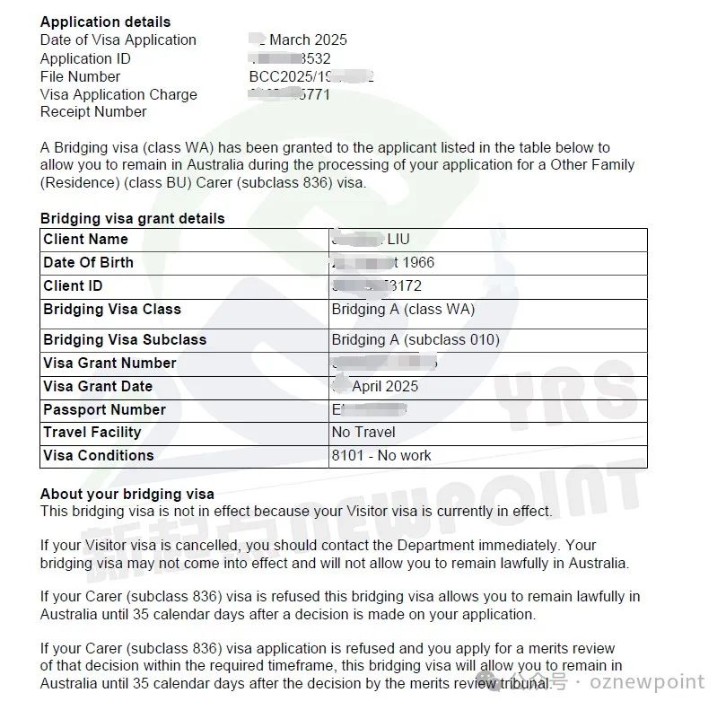 • Carer Visa(子类836)申请人在申请和签证决定 时都必须在澳洲境内,可以拿到过桥签证