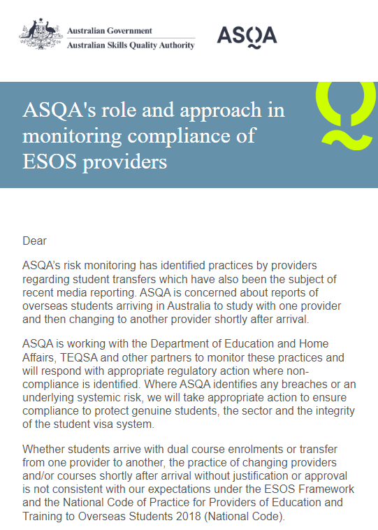 澳洲ASQA技术质量监管部门宣布将和内政部、教育部及TEQSA等部门合作,严肃查处半工半读,严厉打击虚假留学行为。