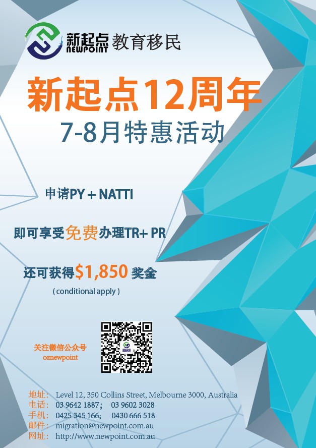另外,即日起,只要关注新起点微信公众号:oznewpoint 即可到新起点公司领取价值达$50澳元的一份礼品。送完为止。