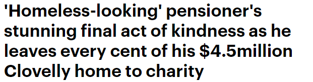 澳老人去世后, 捐出卖房所得百万遗产! 身边人都惊呆了: 以为他很穷