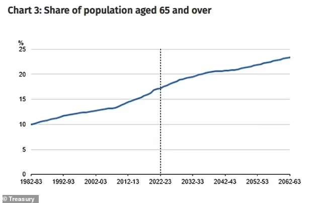 Kennedy博士援引财政部代际报告(Intergenerational Report)的预测称,到2062-63年,65岁及以上人口的比例将攀升至23.4%,高于上一财年的17.3%。