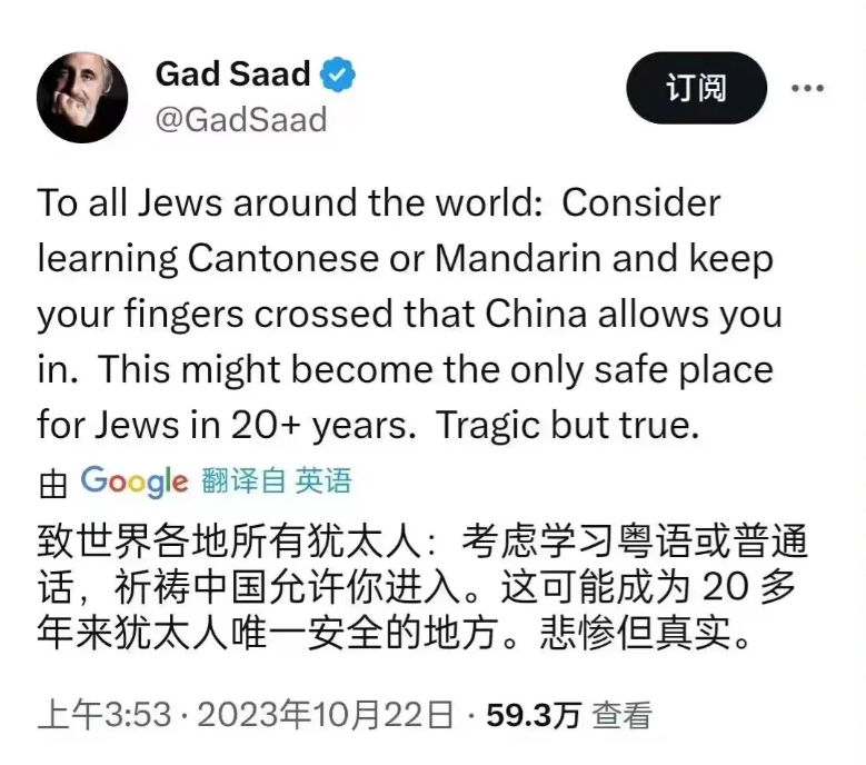 最近巴以冲突持续,全世界都在刷屏,突然,社交媒体上出现了这样一个帖子。认为全世界各地的犹太人应该学习普通话或者粤语,为了进入中国做准备。