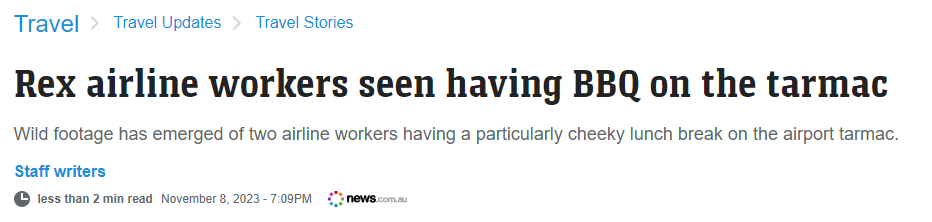 “我总是乘坐Rex的航班,他们的国内航班总是最友好,价格最公道的,从未有过任何延误,所以地勤人员值得享受这顿烧烤。”