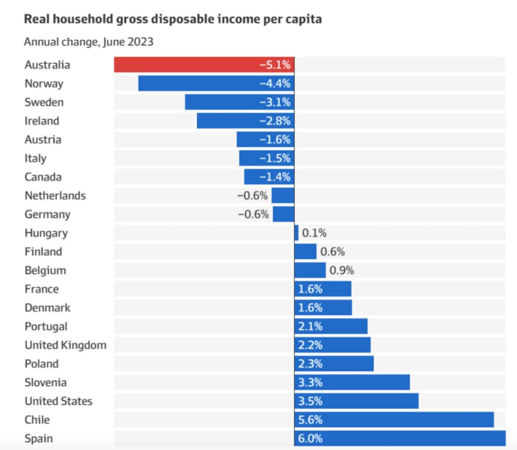 整体跌幅达到了惊人的5.1%,数据显示,上一财政年澳洲家庭人均实际可支配收入已回落至2019年初的水平,仅略高于2010年。这也是全球范围内家庭实际可支配收入的最大跌幅。