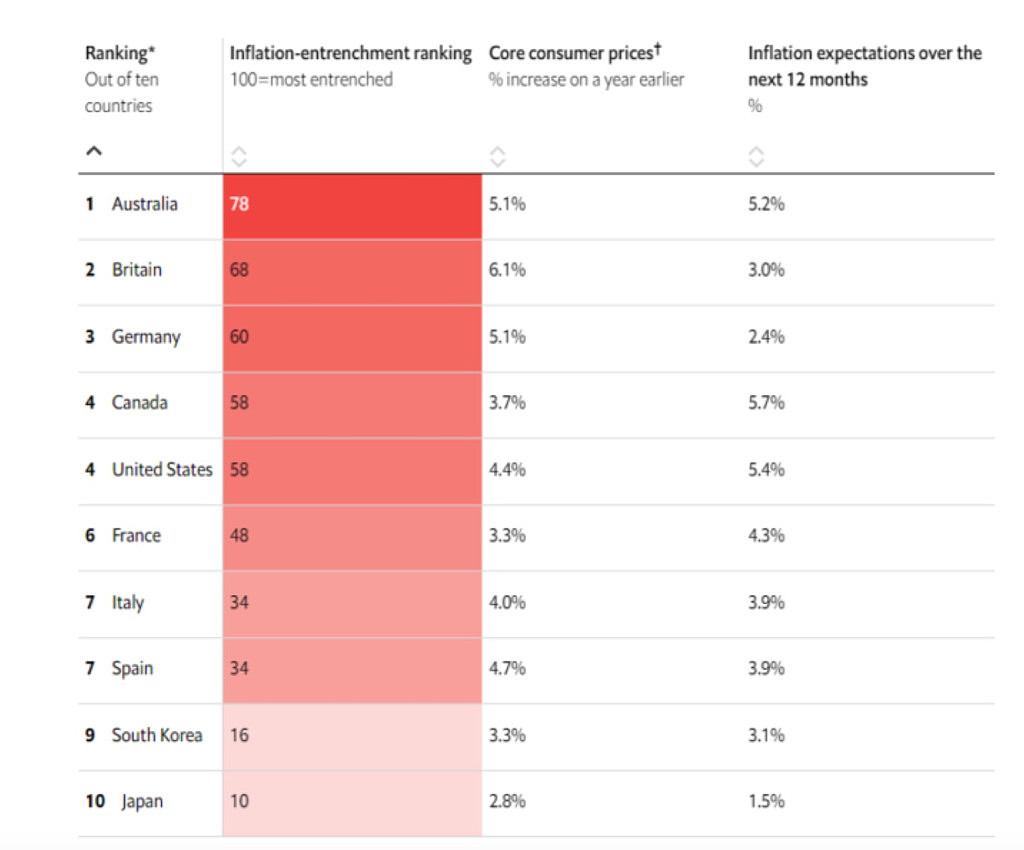 最后,《经济学人》杂志本月将澳洲排在了通货膨胀上涨的首位,部分原因是其强劲的租金增长。