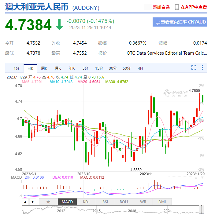 截止到今天下午2点,澳元兑人民币汇率都呈现明显的下跌趋势,但是从11月23日到昨天,澳元兑人民币汇率都是一路上涨的,特别是昨天,还出现了一次快速的猛涨。
