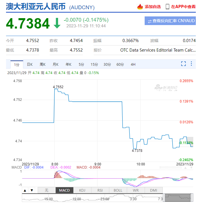 今天汇率的开盘价格就很高,1:4.755开盘,之后就一路下跌。现在暂时稳定在1:4.73左右。