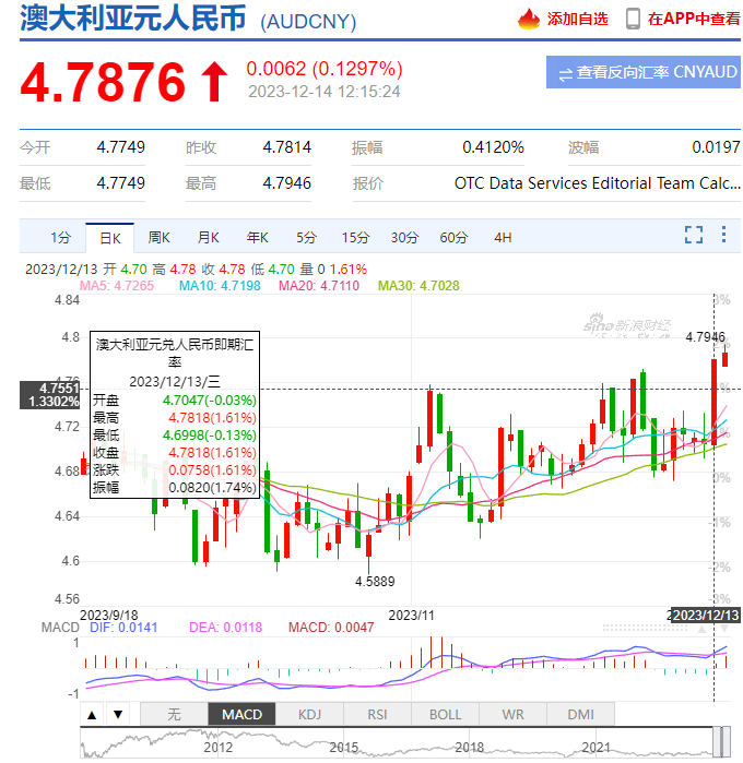 而且在下午的时候,澳元兑人民币汇率一度达到了1:4.7946,无限接近4.8关口。只不过最终没能突破,在高点开始有所下降。