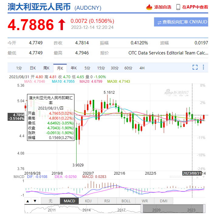 看一下昨天澳元兑人民币汇率的变化数据:单日汇率从最低点的1:4.704,一路上涨到了最高点的1:4.781。