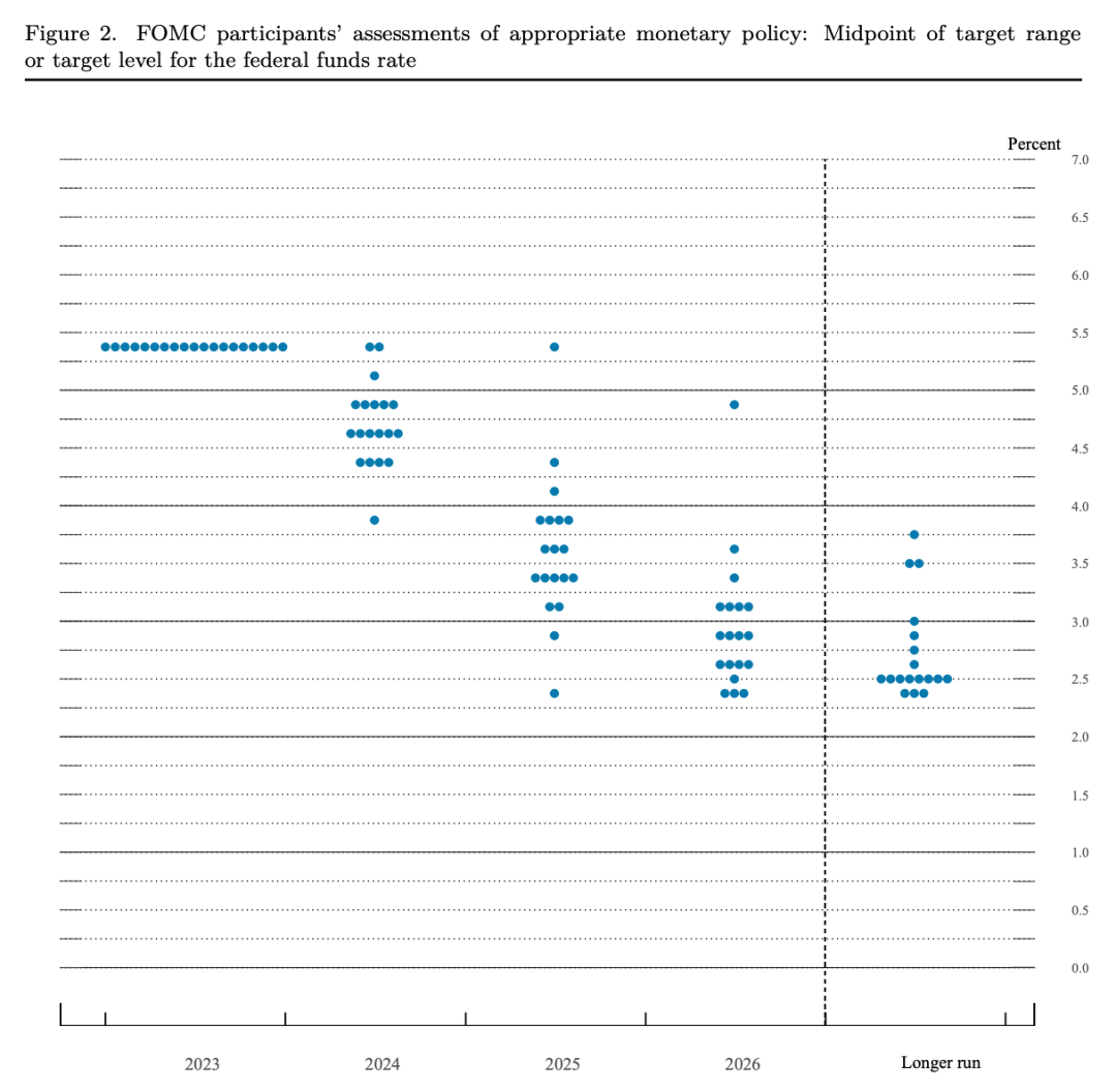 点阵图显示,本次提供利率预测的19名联储官员中,共有16人预计明年利率会降至5.0%以下。